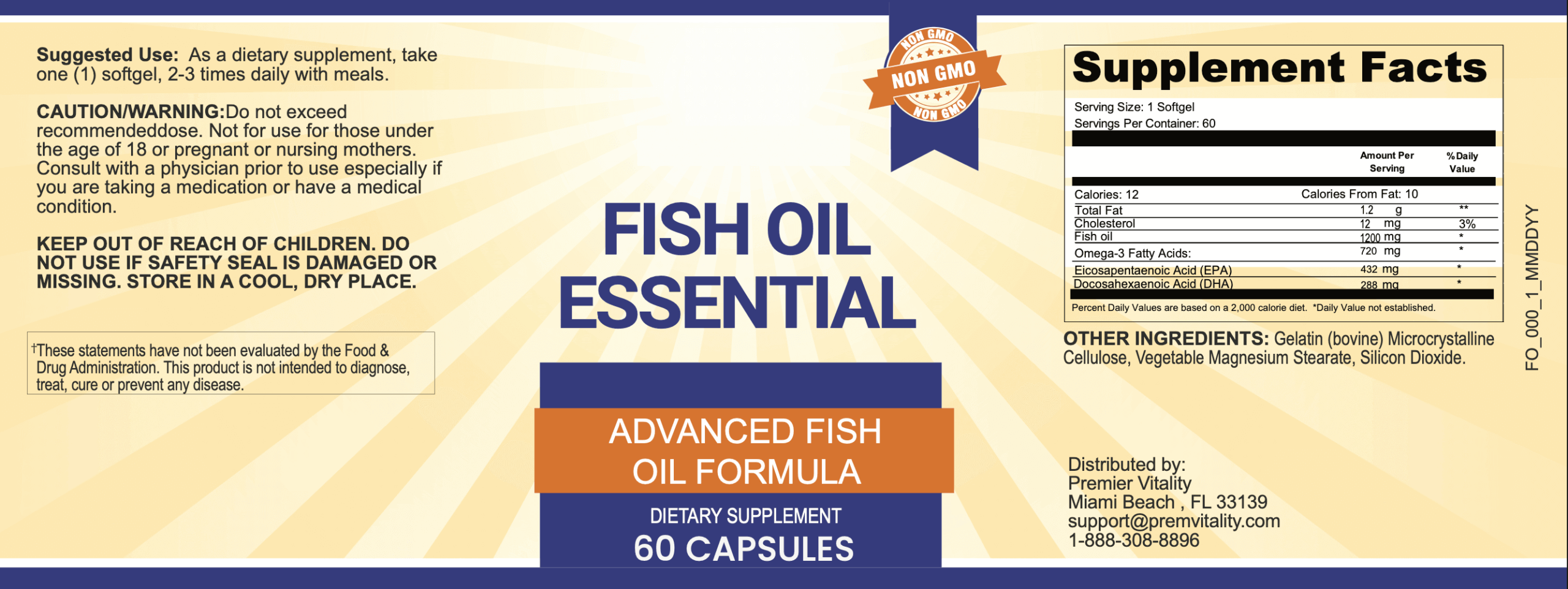 Introducing Fish Oil Essentials, the ultimate omega-3 fish oil supplement designed to enhance your overall well-being. Packed with the purest, highest-quality fish oil, our premium formula offers a potent dose of EPA and DHA fatty acids, essential for supporting heart health, promoting brain function, and maintaining joint flexibility. With each softgel, you’ll experience the remarkable benefits of improved cardiovascular function, enhanced cognitive performance, and reduced inflammation. Our Fish Oil Essentials is meticulously crafted to ensure maximum purity, potency, and absorption, making it an indispensable addition to your daily routine. Unlock the power of omega-3s and embrace a healthier, more vibrant life with Fish Oil Essentials.