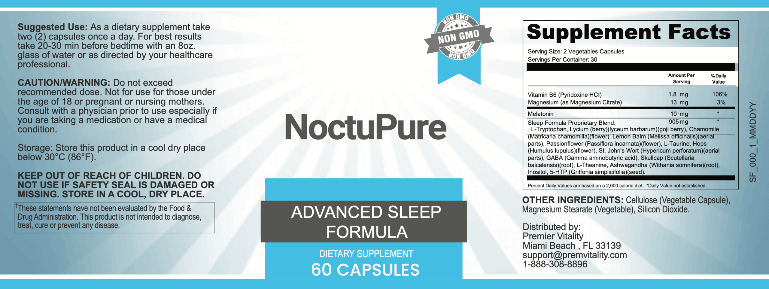 NoctuPure is an extraordinary sleep solution specially crafted to help you experience the best sleep of your life! We understand how important it is for you to feel rested and rejuvenated each morning, and that's why NoctuPure is here to make a difference. This remarkable supplement is formulated with a blend of natural ingredients that work together to support your body's natural sleep patterns and promote deep, uninterrupted slumber. Unlike other sleep aids that may leave you feeling groggy or drowsy the next day, NoctuPure is carefully formulated to promote natural, refreshing sleep. Its unique blend of ingredients works in harmony with your body, helping you to achieve a more restful sleep without any lingering side effects. With NoctuPure, you can say goodbye to restless nights, tossing and turning, and hello to mornings filled with energy and clarity. NoctuPure is the answer to your sleep struggles, providing a safe and effective solution to help you reclaim your nights and wake up feeling revitalized. Experience the magic of NoctuPure and embrace the beauty of a truly restful sleep. Your path to a brighter tomorrow starts tonight with NoctuPure!